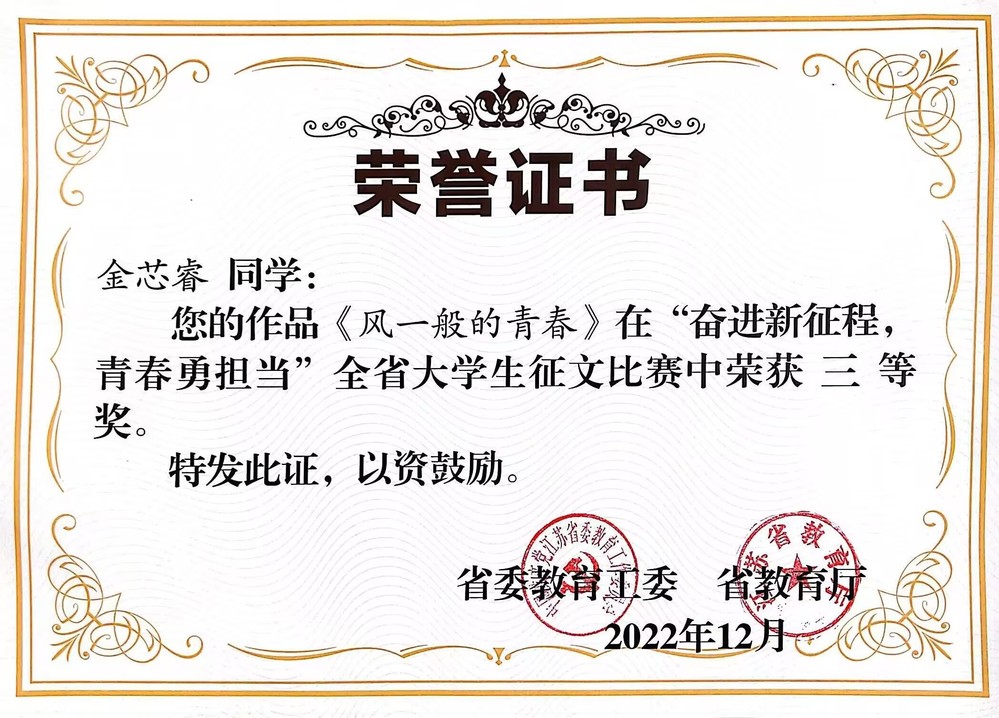 2022年11月1日,全省开展了以“奋进新征程,青春勇担当”为主题的大学生征文比赛,在学校和广大同学的支持,此次活动获得了积极的响应,各位同学挥洒自己的文笔,将青年的一腔热血写了下来。