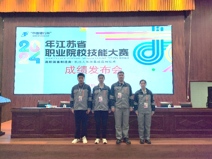 1月17日—19日,2024年江苏省职业院校技能大赛高职组“机器人系统集成”赛项在无锡职业技术学院进行,共有来自全省各高职院校的118名教师及学生选手进行了同场竞技。我系机电一体化技术专业学生支崇炫、王震宇在叶泉、蔡新宇两位老师的指导下获得团体二等奖第一名,成功进入2024年江苏省集训队伍,许璐、蔡可义两位老师获得教师组团体二等奖。