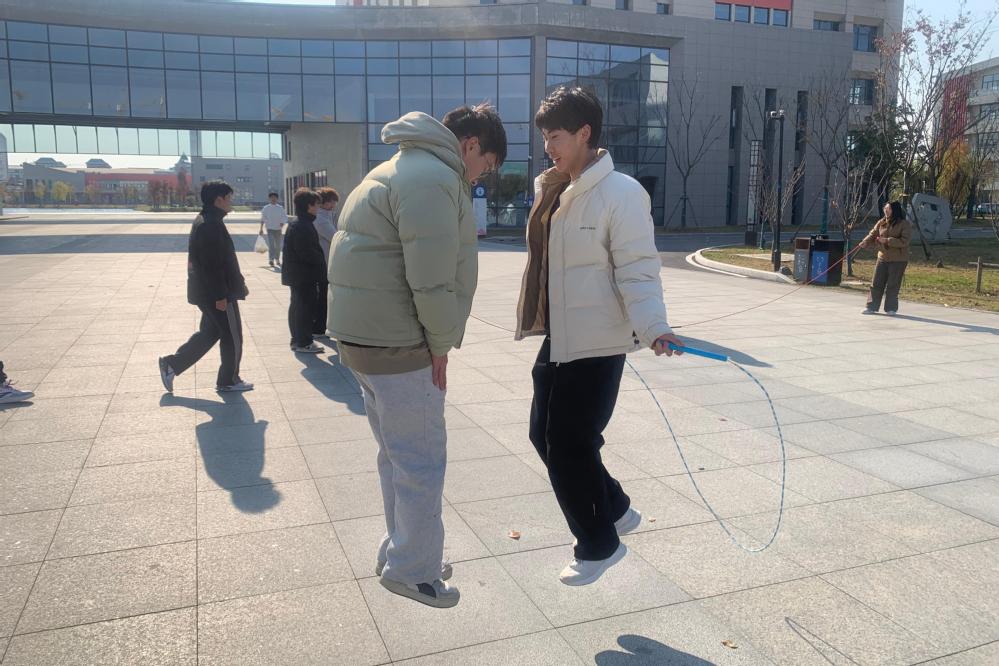 紧接着的双人跳绳项目,要求师生之间两两合作,共同完成一系列高难度、富有趣味性的跳绳动作。从最初的生疏到后来的默契配合,都伴随着现场观众的热烈掌声和欢呼声,同步的跳跃与甩绳动作尽显协作之美。在跳绳的翻飞中,不仅展现了高超的跳绳技巧,更传递了师生间相互尊重、共同进步的和谐氛围。