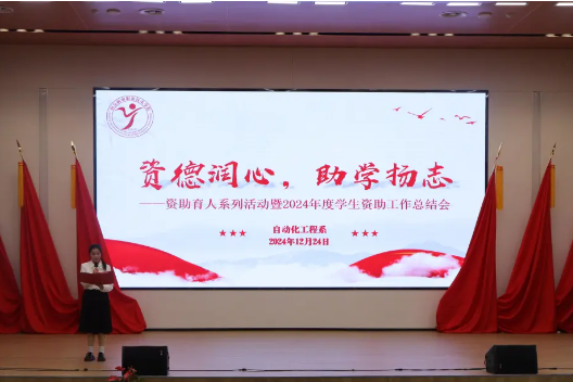 为深入学习贯彻党的二十届三中全会精神,深化关工委关爱助学工作,切实加强系部资助宣传大使团队建设,持续助力学生健康成长,教育引导青年学子立报国强国大志向、做挺膺担当奋斗者,12月24日,自动化工程系在乐学楼报告厅成功开展资助育人系列活动暨2024年度学生资助工作总结会。自动化工程系学工团队全体成员、学生干部代表和全体受助学生参与活动,活动由2024年国家励志奖学金获得者学生代表张建蓉主持。