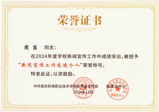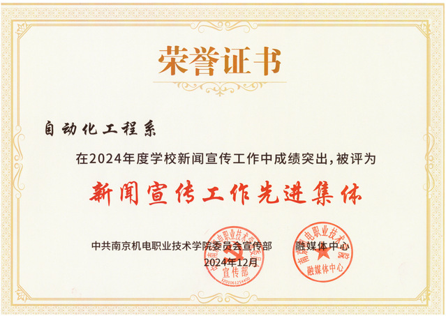 喜报:自动化工程系获评2024年度学校新闻宣传工作先进集体 周笛获评新闻宣传工作先进个人