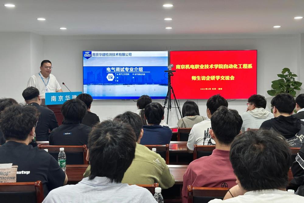 5月15日下午,自动化工程系近30名即将开展岗位实习的2023级学生参与“青柠实践实境课堂”活动。同学们在系团委书记周笛、系党支部组织委员、就业干事俞青老师带领下走进南京华建检测技术有限公司参观学习,南京华建检测技术有限公司党总支副书记、工会主席高传喜、公司综合管理部经理邢丽娟热情欢迎来访师生。